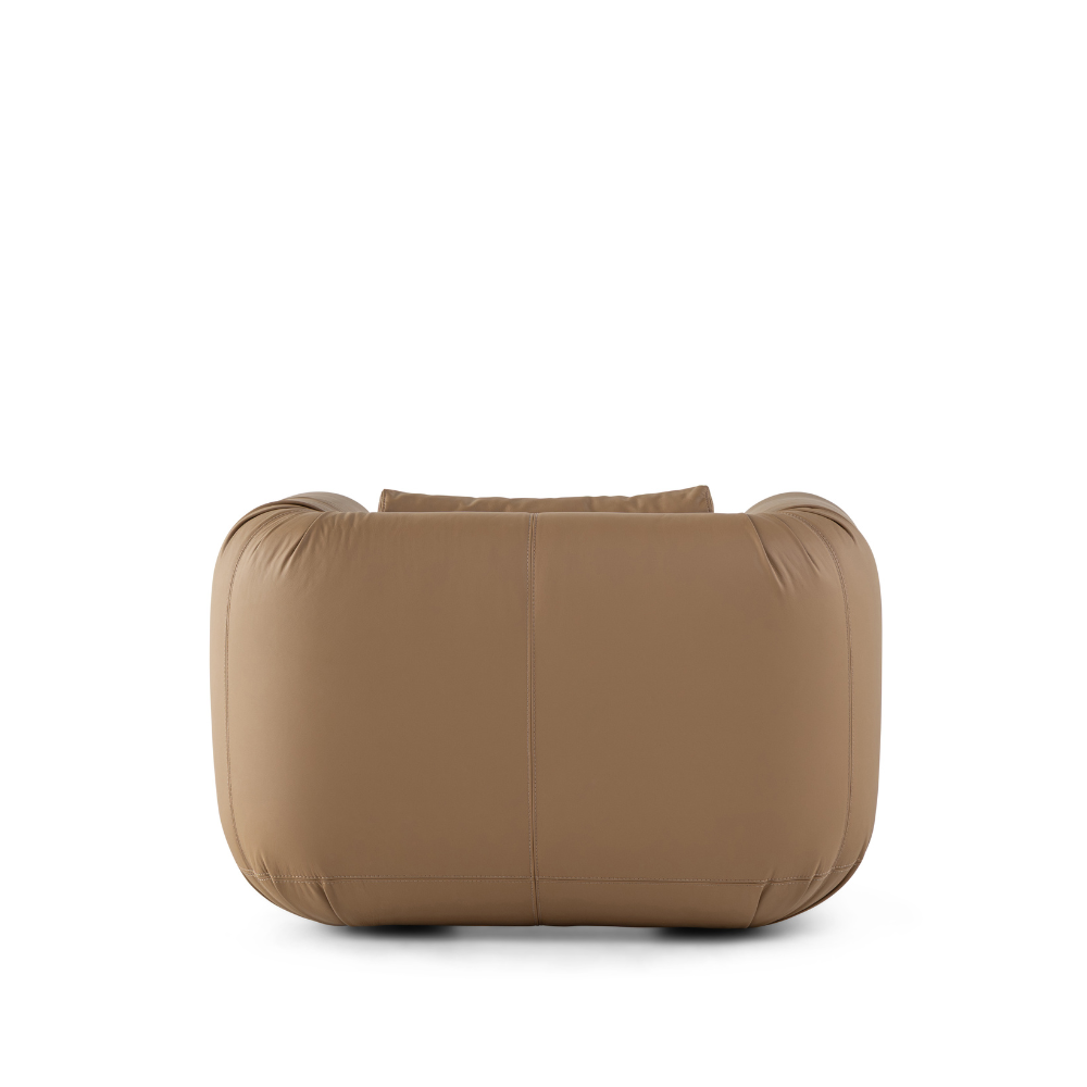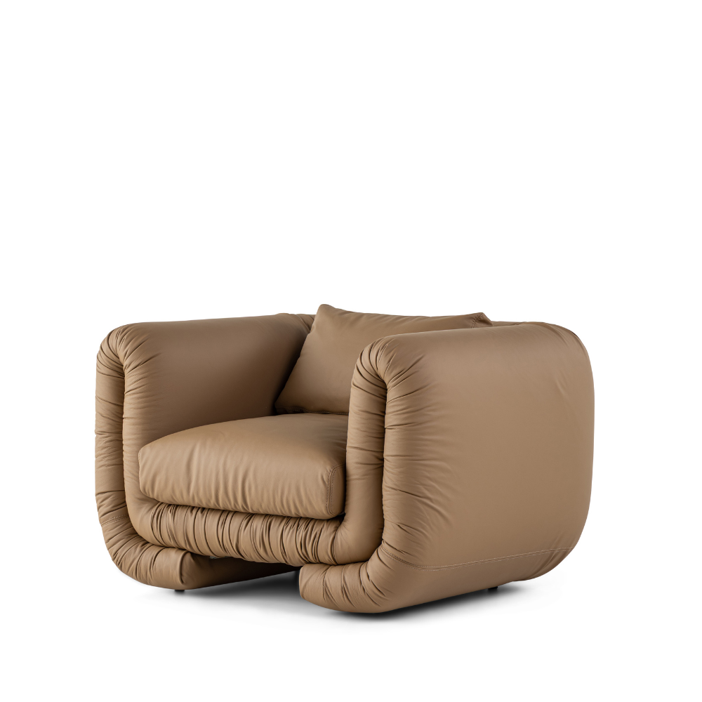 Uma referência direta a Abaporu, uma das mais icônicas obras de Tarsila do Amaral, onde a artista modernista representa a ligação do homem com a terra Os braços laterais tem uma única linha que se dobra abaixo da estrutura, dando um desenho singular e provocativo a peça. Além de formas arredondadas desafiadoras, revestir a peça inteira traz personalidade com o efeito desejado e proposital das rugas para evidenciar a mobilidade do couro.