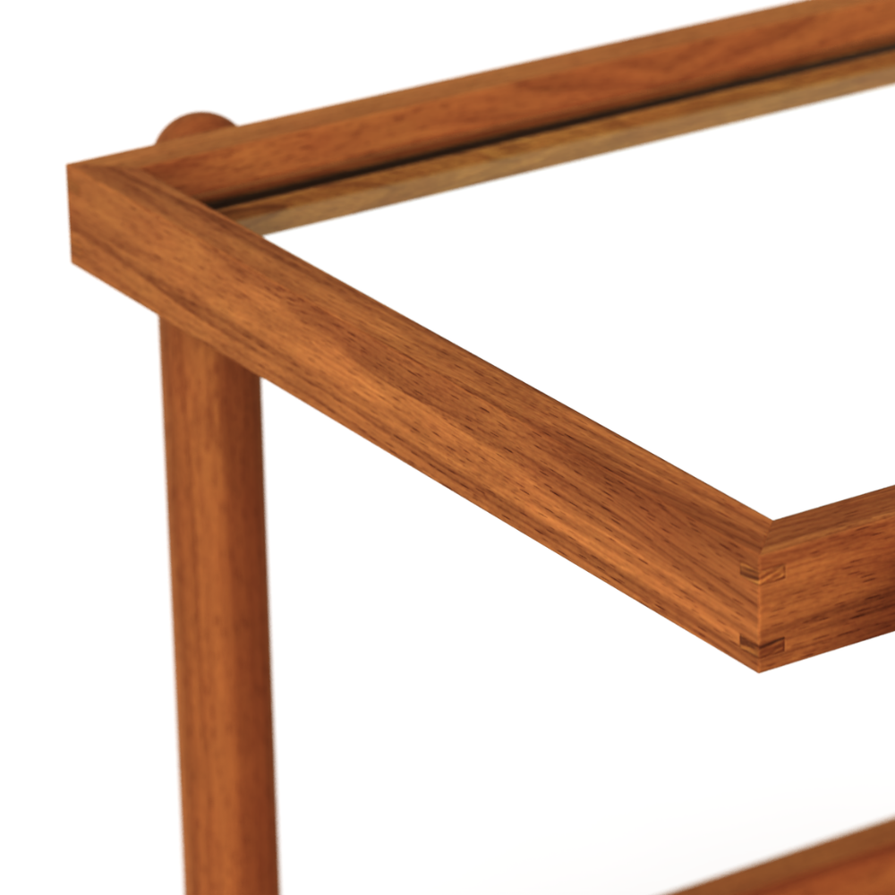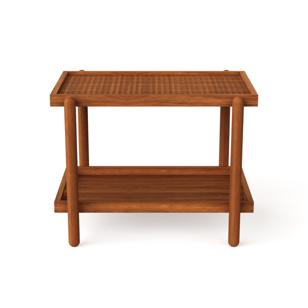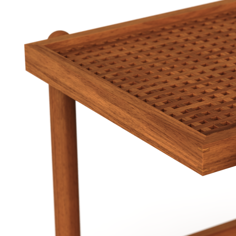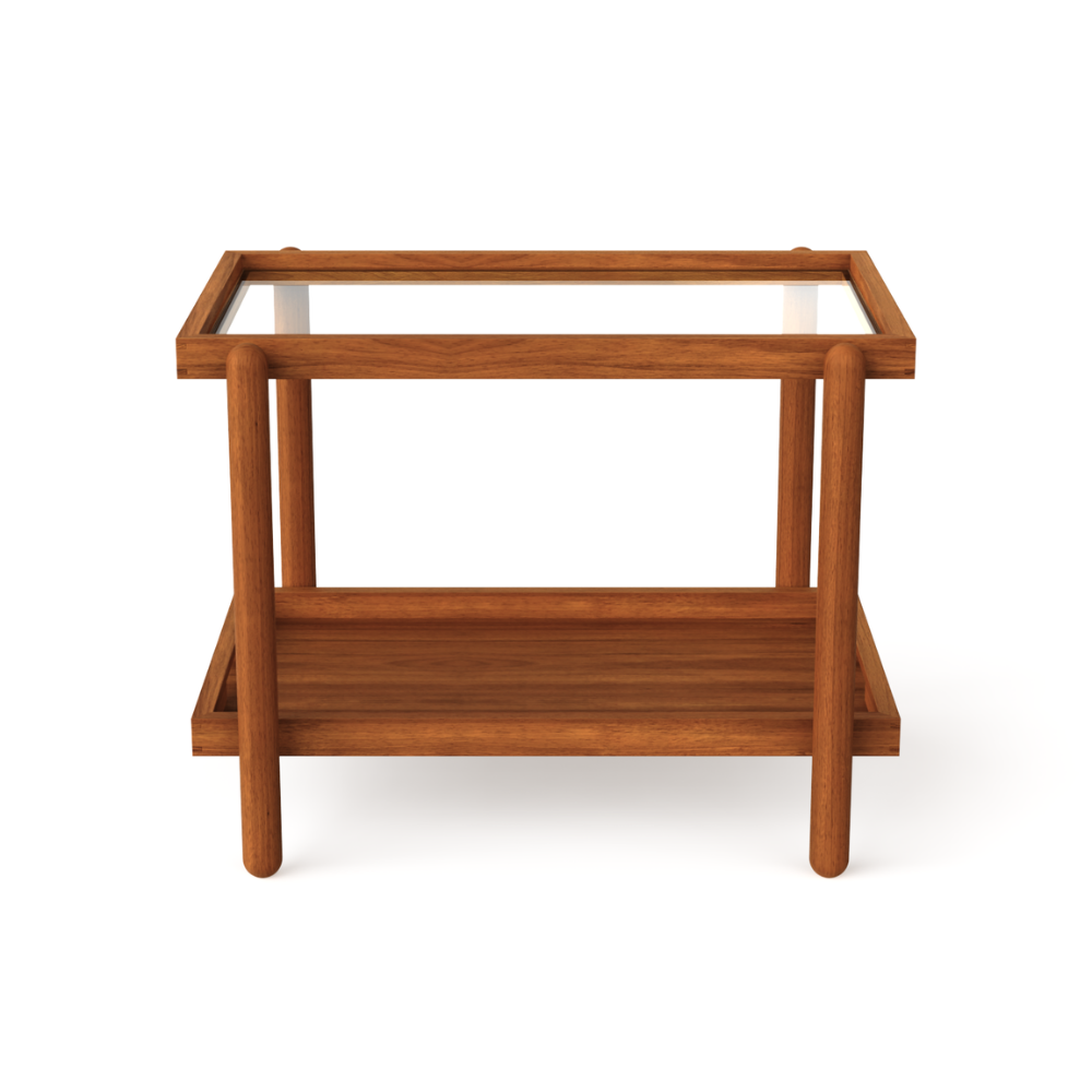 Com estrutura de duplo apoio, a Mesa Lateral Cós se destaca pela versatilidade e riqueza de detalhes. O tampo superior pode ser personalizado em vidro ou em uma delicada treliça, cujas ripas próximas conferem textura e transparência ao móvel. A base complementa o conjunto com uma superfície inferior folheada que funciona como bandeja solta, ampliando as possibilidades de uso da peça.