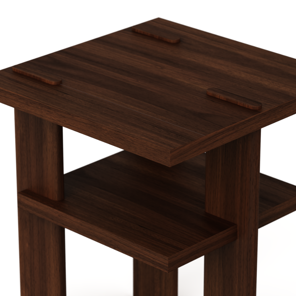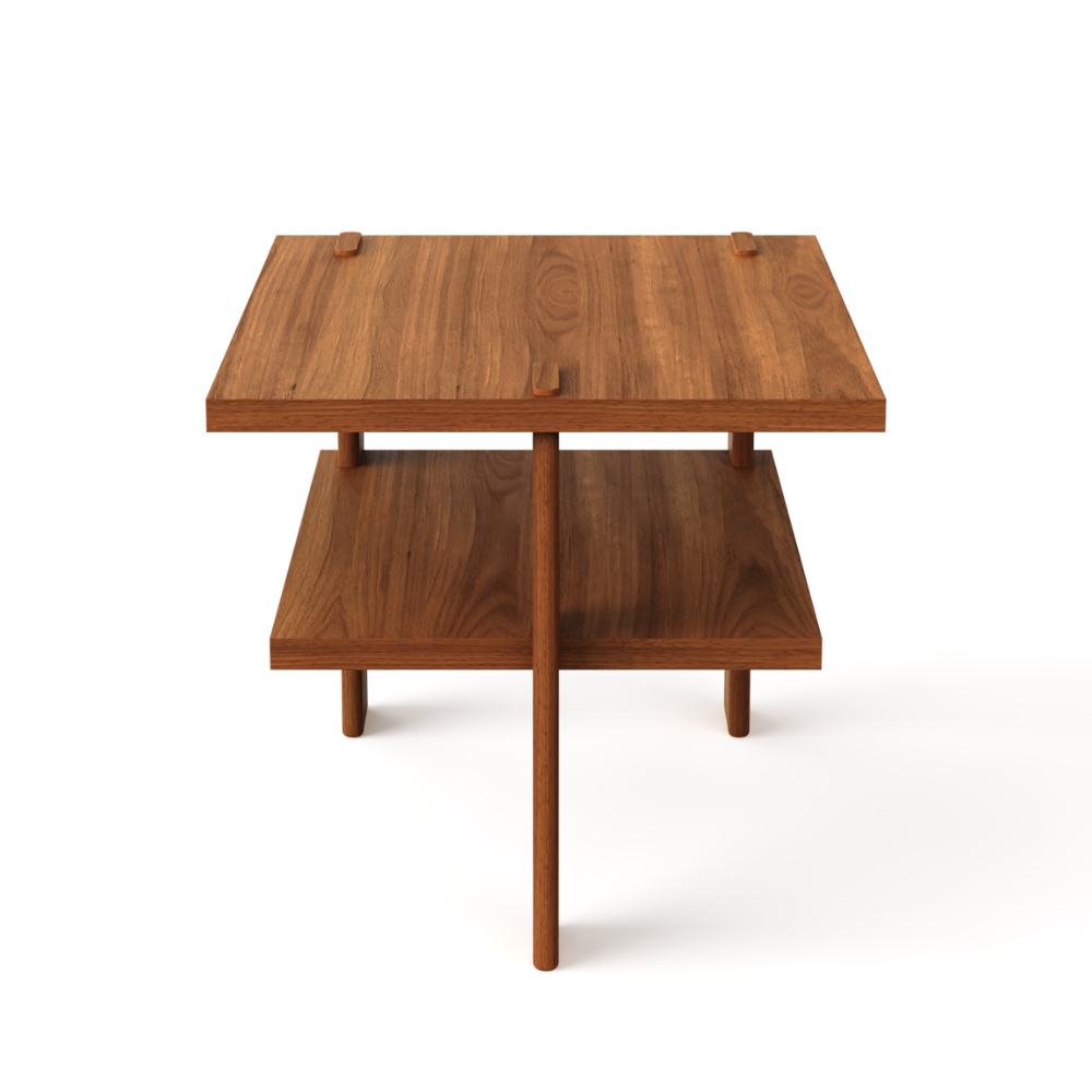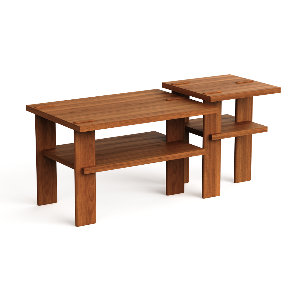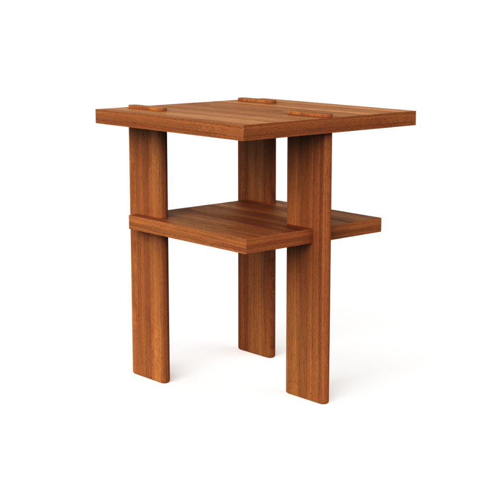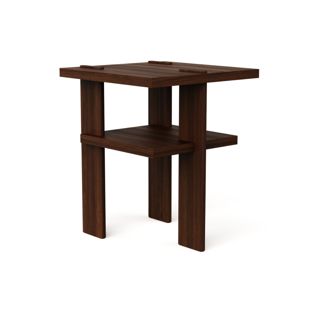 A Mesa Lateral Figura oferece versatilidade com opções em duas alturas, ideais para uso individual ou composições integradas. O destaque do design é o equilíbrio estrutural, no qual três pés em madeira maciça se conectam aos planos, integrando visualmente o tampo superior e a prateleira inferior em uma peça única e coesa.