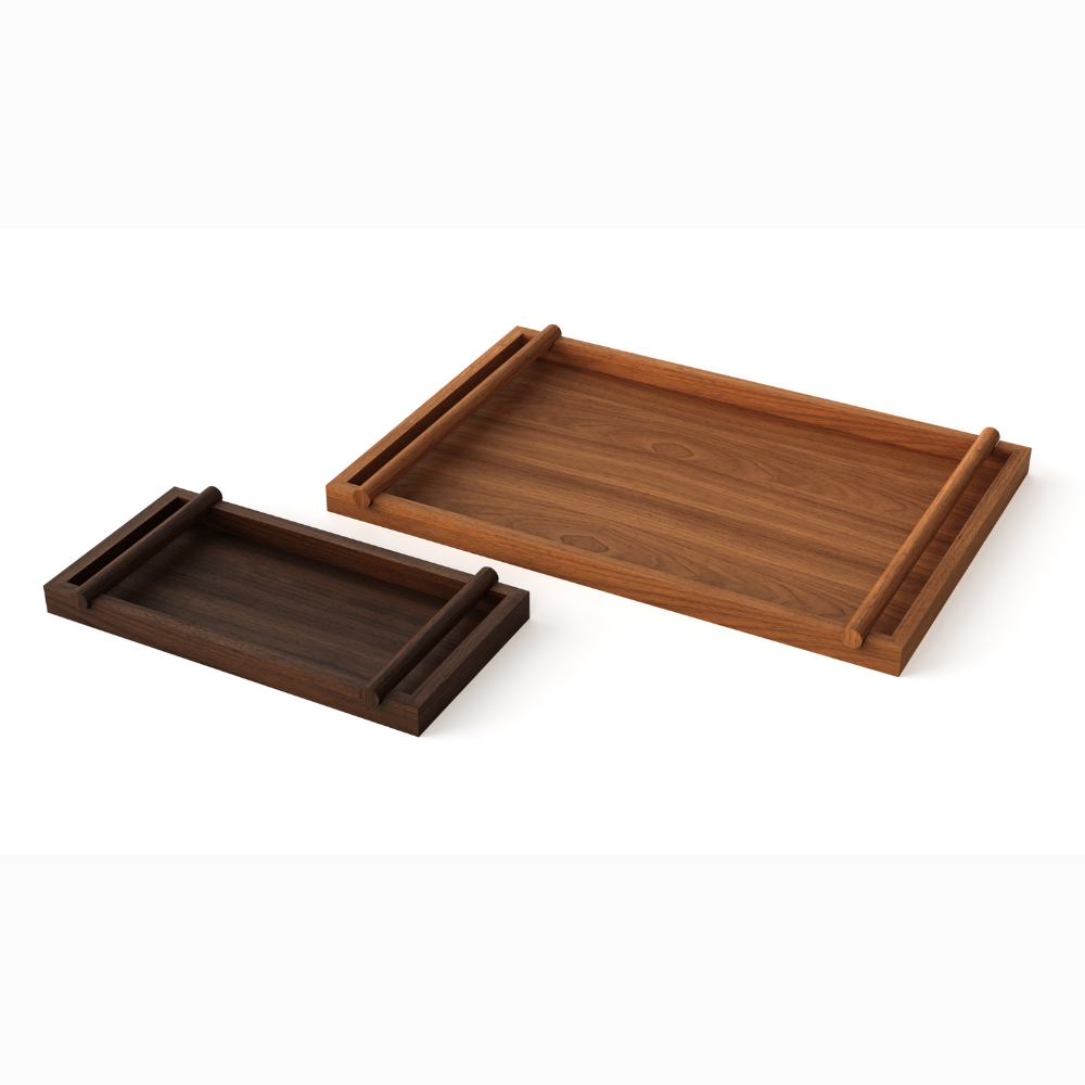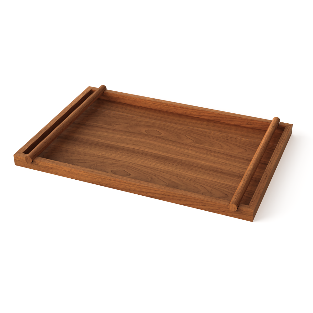 Descrição: Os complementos são essenciais para humanizar e finalizar o ambiente. Na Bandeja Gaia, a estrutura retangular em madeira apresenta bordas delimitadas e pegadores tubulares que repousam sobre elas.