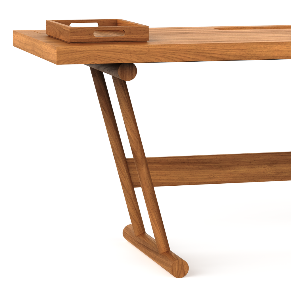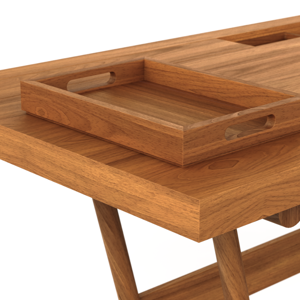 Tampo em MDF laminado; Base e bandeja menor em madeira maciça tauari; Bandeja maior em MDF laminado e madeira maciça tauari