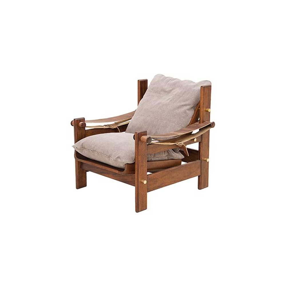 Esta poltrona tem toda sua estrutura em madeira maciça, aparente, sendo que o assento e o encosto são em cambotas em forma de quadro ou molduras cujo vazio é preenchido por cintas de couro afiveladas. Também de couro são seus braços, e também afivelados, os quais são contidos por botões de madeira. São vistos quatro botões de metal dourado que fixam as travessas de madeira às duas laterais. Os dois almofadões fazem o seu conforto.