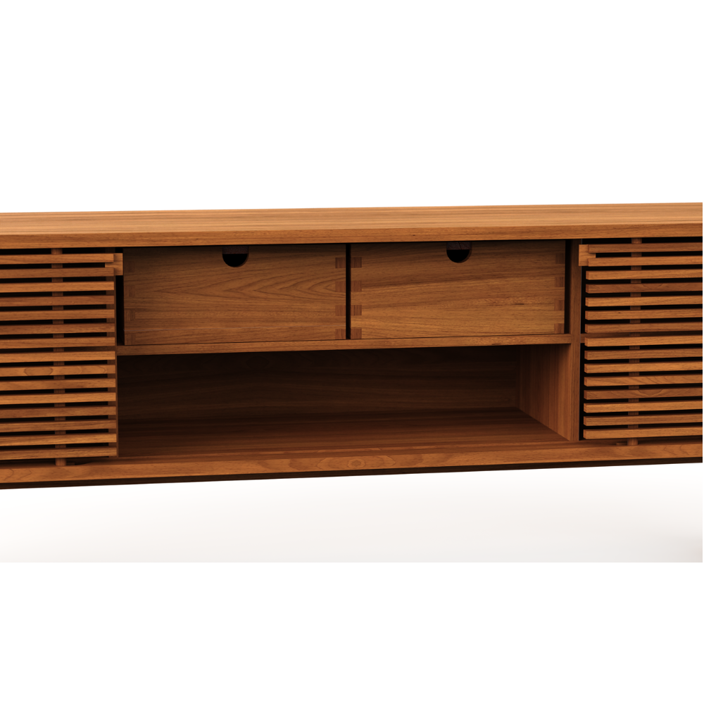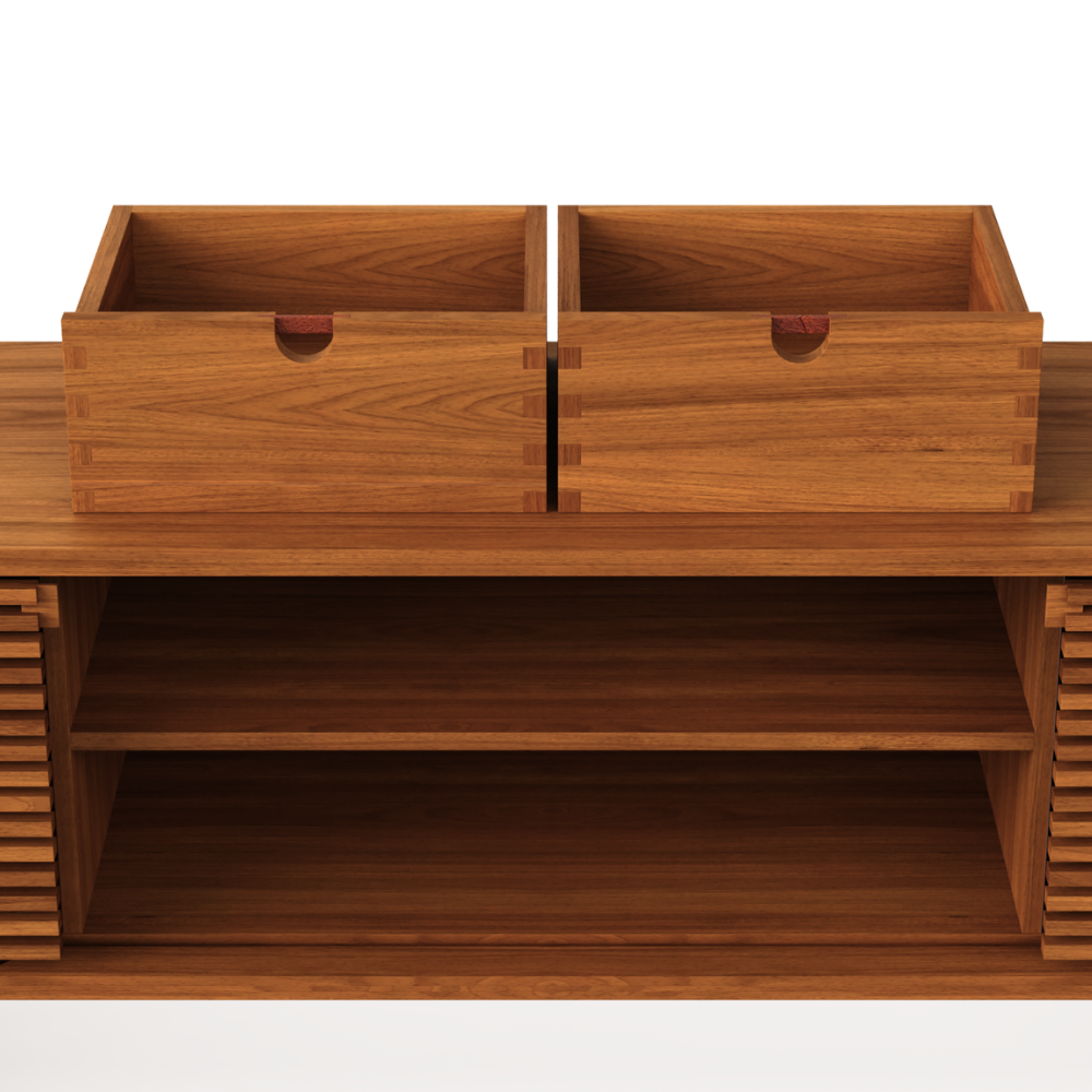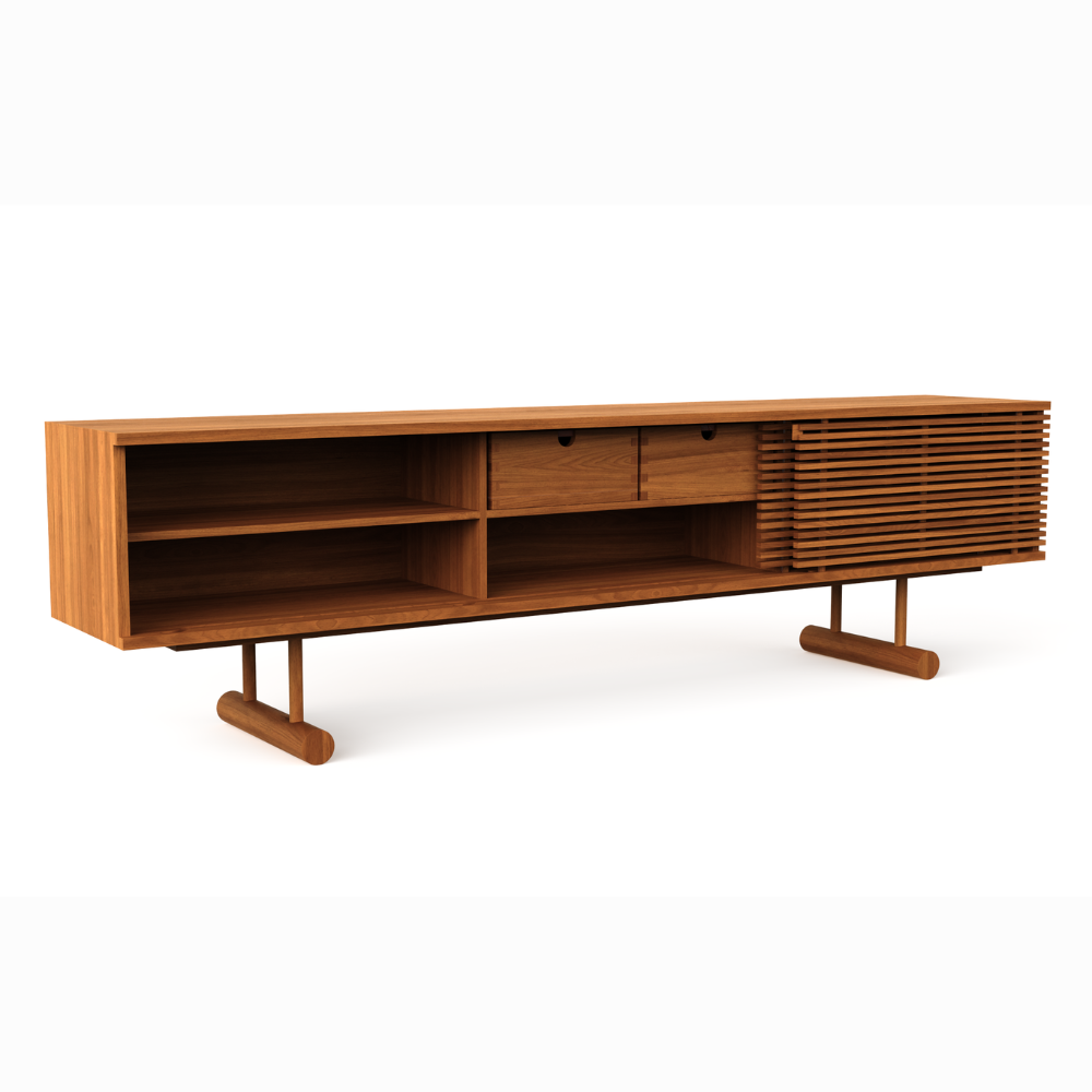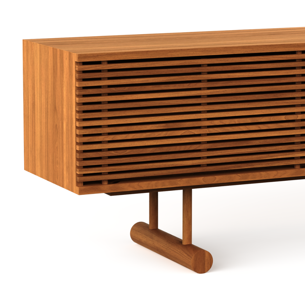 A linha Scope, termo derivado do grego para “olhar”, propõe uma observação cuidadosa do design. O principal destaque do Buffet são as portas deslizantes com sistema de abertura coplanar, onde um trilho curvo permite a sobreposição fluida dos painéis. O acabamento ripado filtra a luminosidade e confere leveza, enquanto a base é formada por pilares sobre um elemento circular maciço. Além disso, a peça conta com duas caixas centrais removíveis. Assim, a peça combina estética e funcionalidade.