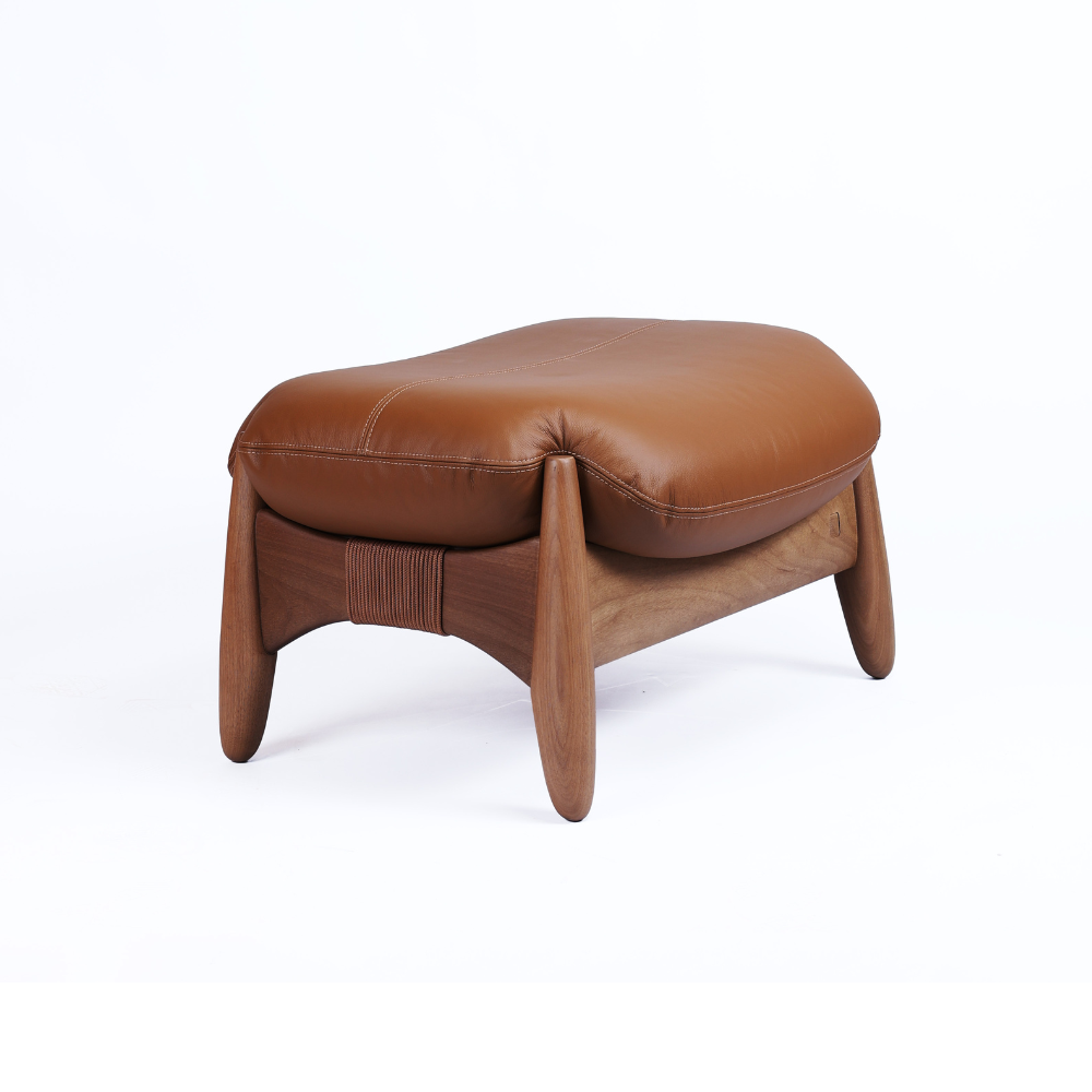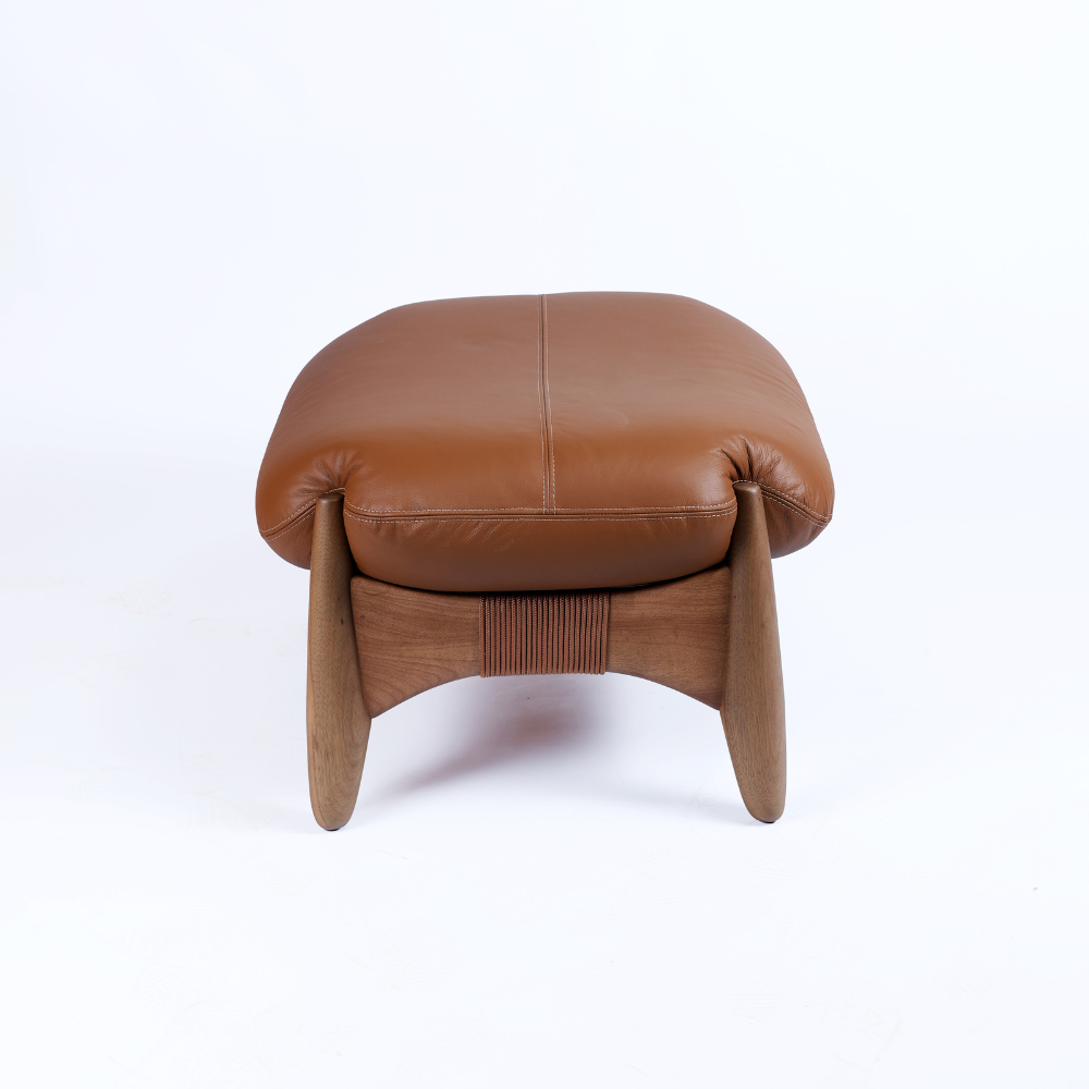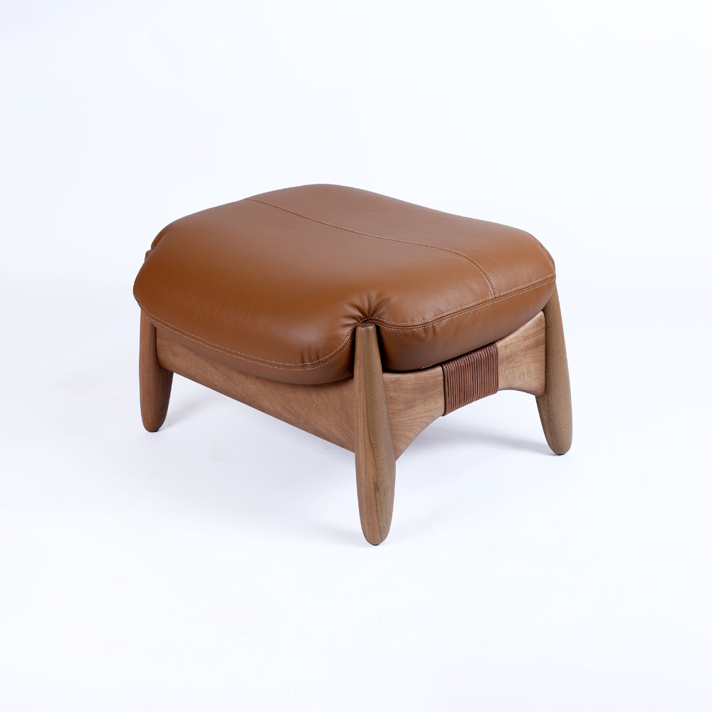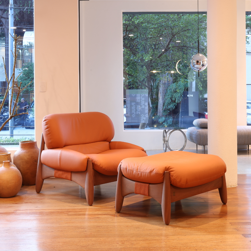 Descrição: Mauricio Marquez dá vida à poltrona e ao puff Terra, inspirados no solo que nos forma como nação. A peça se firma na solidez da madeira e na nobreza do couro, traduzindo a essência de um Brasil que se molda entre tradição e inovação. Um tributo ao solo brasileiro: imenso, rico e repleto de história.