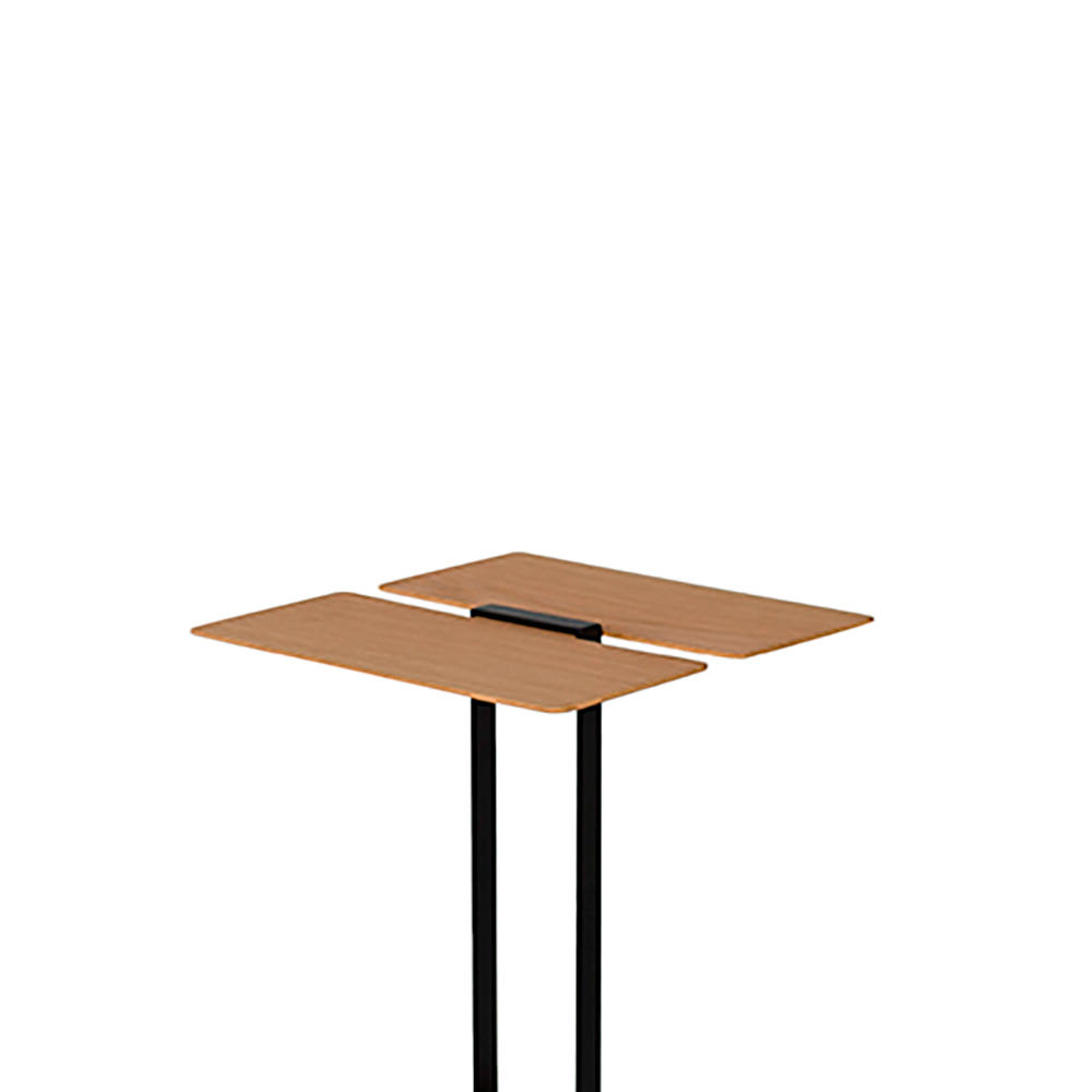 Descrição: Estruturado a partir de uma solida base em madeira usinada, duas hastes em aço emergem para servir de base ao fino tampo, enlaçando-o sutilmente na parte superior. Neste enlace o tampo tem seu desenho recortado, como se tivesse sido subtraído pelas formas.